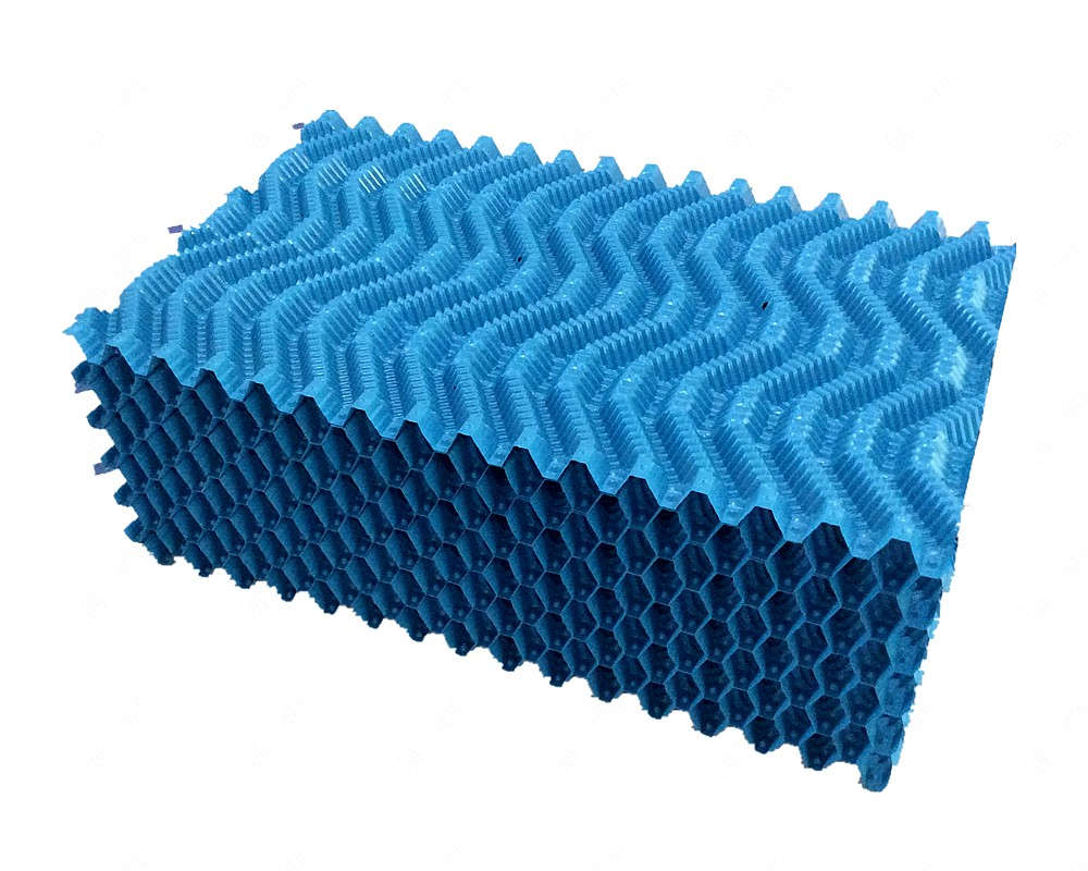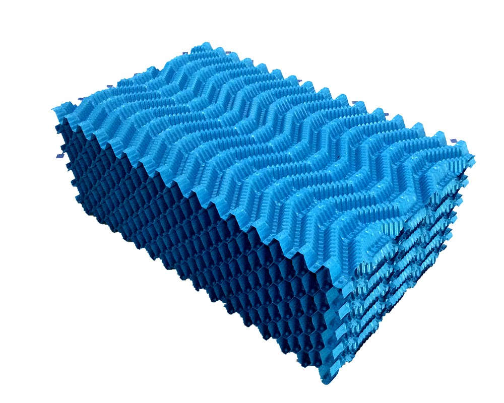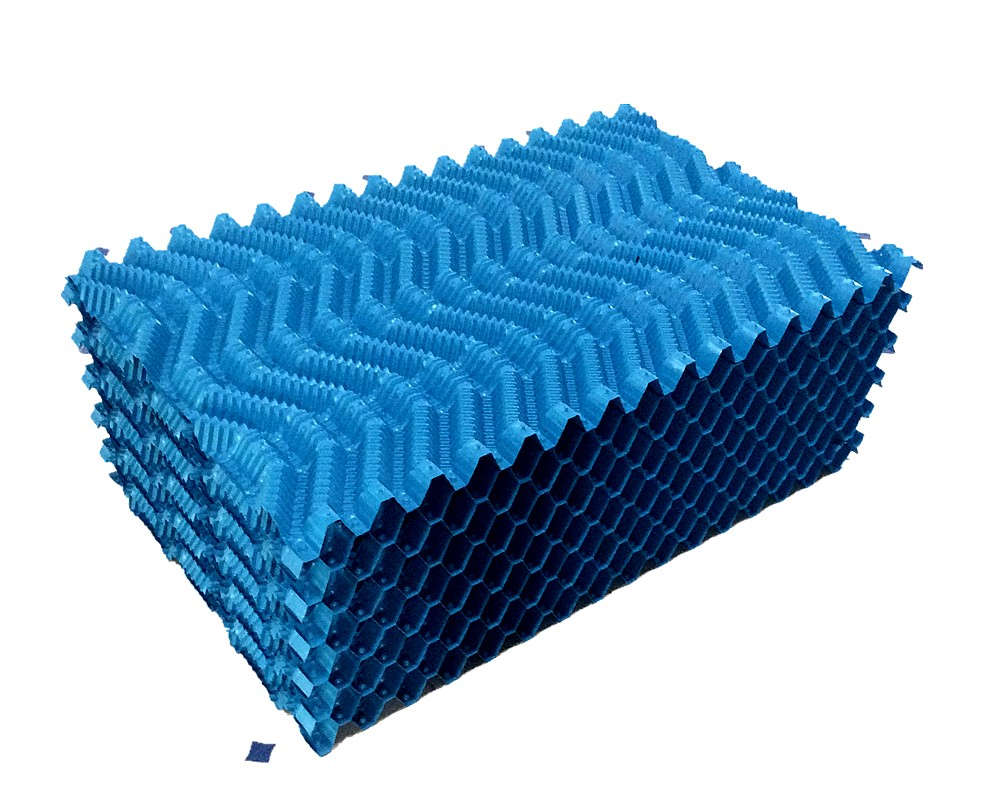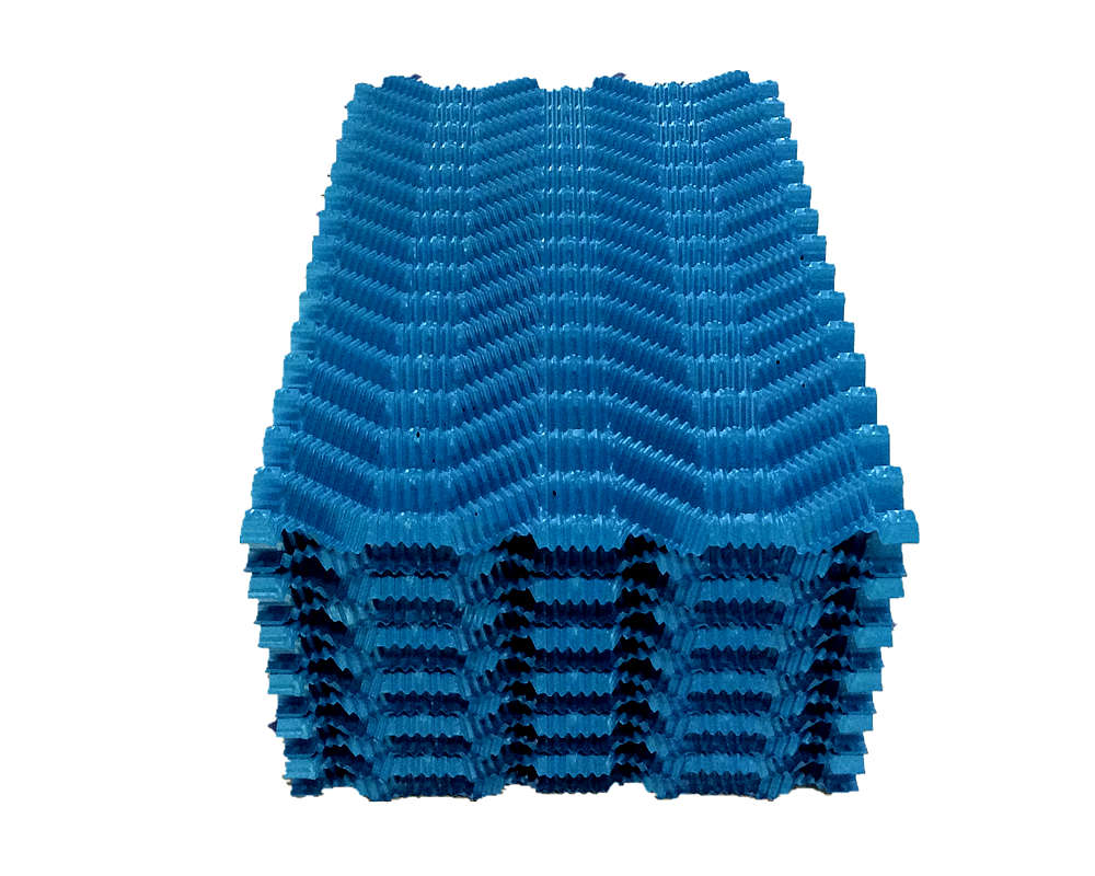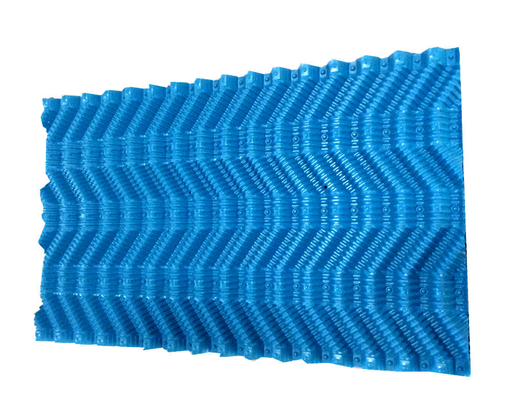 冷卻塔塔芯填料是由優(yōu)質(zhì)PVC聚乙烯片正負(fù)壓及吸塑而成,主要采用了水紋波形、梯形波、點(diǎn)波形、S波型、人字波形填料,散熱面積增長(zhǎng)系數(shù)大,水流在板面上分布性能好,水和空氣流經(jīng)板面時(shí)擾動(dòng)大等優(yōu)點(diǎn)。填料不易變形,耐高溫,抗老化,且阻燃性能好,風(fēng)阻系數(shù)小。安裝方便,易清洗,運(yùn)輸方便該散熱填料采用粘接式及懸掛式,安裝簡(jiǎn)便,便于清洗,且成功解決了粘接填料因吸積垢、自重而產(chǎn)生變形,且變形后積垢更加嚴(yán)重、難于清洗的問題。填料阻燃性能好,阻燃氧指數(shù)指標(biāo)為42.7,每立方米組裝體質(zhì)量約為15 kg—30kg/m3,組裝高度為0.5m—3.0m,交錯(cuò)布置,對(duì)于塔壁周邊異形塊可視現(xiàn)場(chǎng)布置情況,按實(shí)際尺寸切割、安裝。