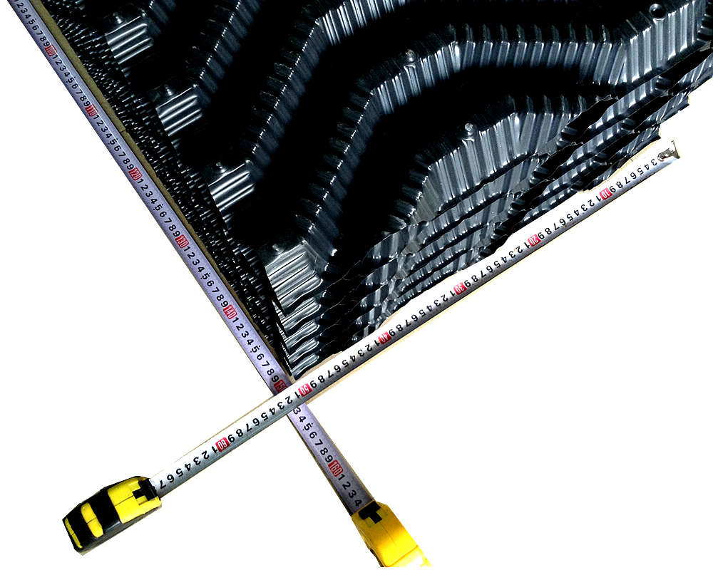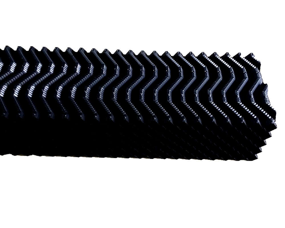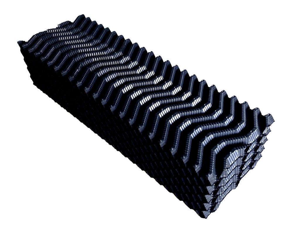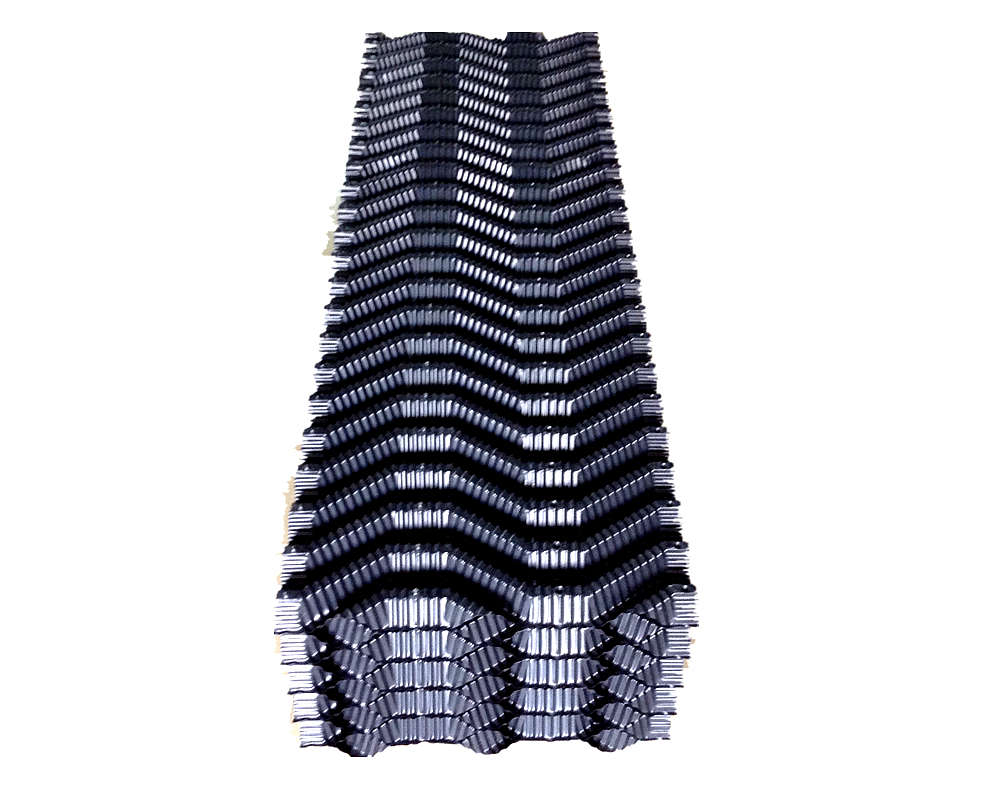 冷卻塔塔芯填料是由優(yōu)質(zhì)PVC聚乙烯片正負(fù)壓及吸塑而成,主要采用了水紋波形、梯形波、點(diǎn)波形、S波型、人字波形填料,散熱面積增長(zhǎng)系數(shù)大,水流在板面上分布性能好,水和空氣流經(jīng)板面時(shí)擾動(dòng)大等優(yōu)點(diǎn)。填料不易變形,耐高溫,抗老化,且阻燃性能好,風(fēng)阻系數(shù)小。安裝方便,易清洗,運(yùn)輸方便該散熱填料采用粘接式及懸掛式,安裝簡(jiǎn)便,便于清洗,且成功解決了粘接填料因吸積垢、自重而產(chǎn)生變形,且變形后積垢更加嚴(yán)重、難于清洗的問(wèn)題。填料阻燃性能好,阻燃氧指數(shù)指標(biāo)為42.7,每立方米組裝體質(zhì)量約為15 kg—30kg/m3,組裝高度為0.5m—3.0m,交錯(cuò)布置,對(duì)于塔壁周邊異形塊可視現(xiàn)場(chǎng)布置情況,按實(shí)際尺寸切割、安裝。